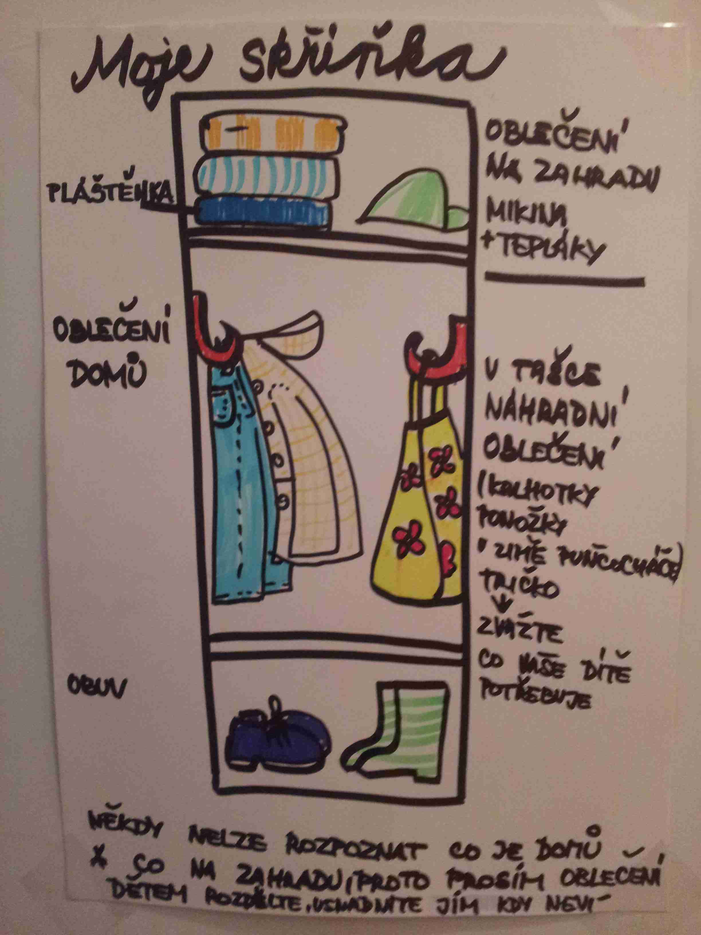 - náhradní oblečení do skříňky (spodní prádlo, ponožky, tričko, tepláky)